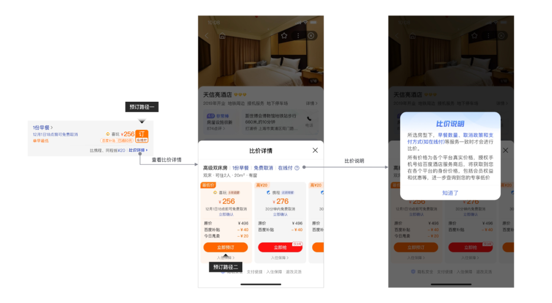 聚合比价模式下,存在了两种用户路径,如图所示。用户可以直接选择最低价资源方完成预订,也可以通过比价详情弹层,查看针对同一服务的所有平台报价,对比平台的详细服务、优惠差异后再选择预订。这种预订模式的目的,一方面在教育用户建立百度酒店可以比价、可以买到低价的认知,另一方面也提升了用户选择低价平台的效率。另外,聚合比价要具有清晰的规则才能被理解和信任,在比价详情中,为了进一步降低认知成本,我们通过标题突出了聚合项,并增加了比价说明入口,让聚合规则更明确。聚合比价的方案上线后,报价的预订点击到成单转化也得到了提升。